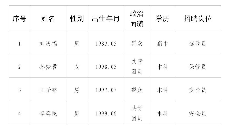 2024年5月22日、6月7日,集团官网发布了民用爆破相关从业人员招聘启事。通过组织对应聘人员的简历筛选、资格审查、考评打分、体检等环节,经研究,以下人员列入拟录用名单,现予以公示。