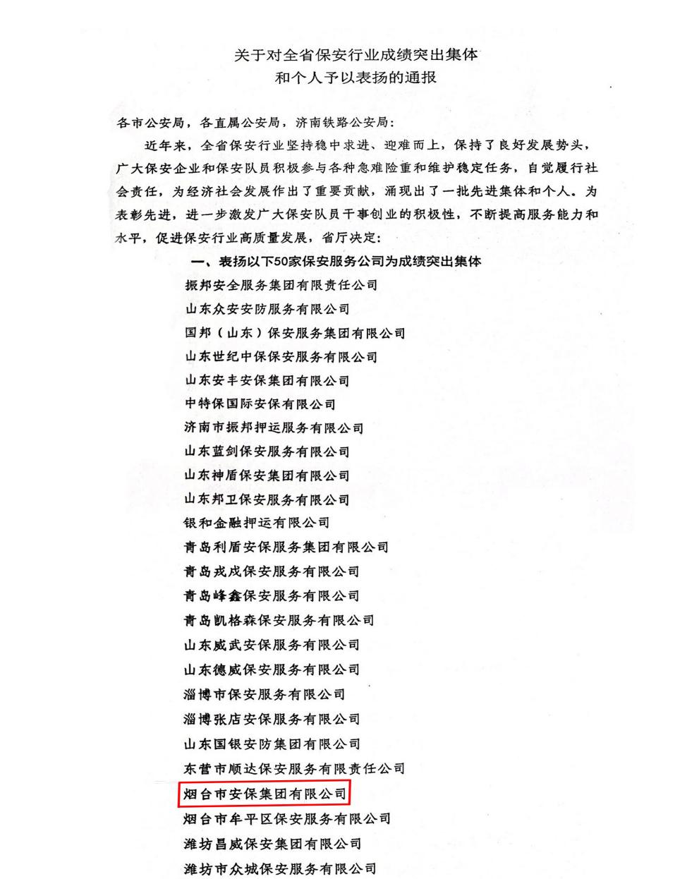 12月31日,山东省公安厅下发《关于对全省保安行业成绩突出集体和个人予以表扬的通报》,通报表扬了2024年度全省保安服务公司成绩突出集体50家和保安员成绩突出个人300名。其中烟台市安保集团获评“全省保安行业成绩突出集体”,公司2人获评“全省保安行业成绩突出个人”。=